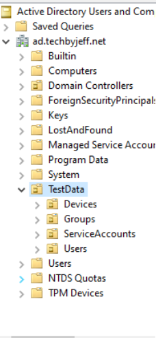 Everything gets created in a top-level TestData OU for easy reference. I built batching into it so with default data and switches it should take a little over a minute for the end-to-end creation.