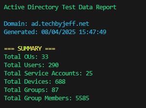 There is also Get-ADTestEnvironmentReport if you'd like to use this in other automations. Default is PSCustomObject output for -Passthru but you can also have HTML, JSON, or CSV outputs. The HTML report is 100% ai assisted since I'm not front-end, so don't yell at me if the css etc is jank.