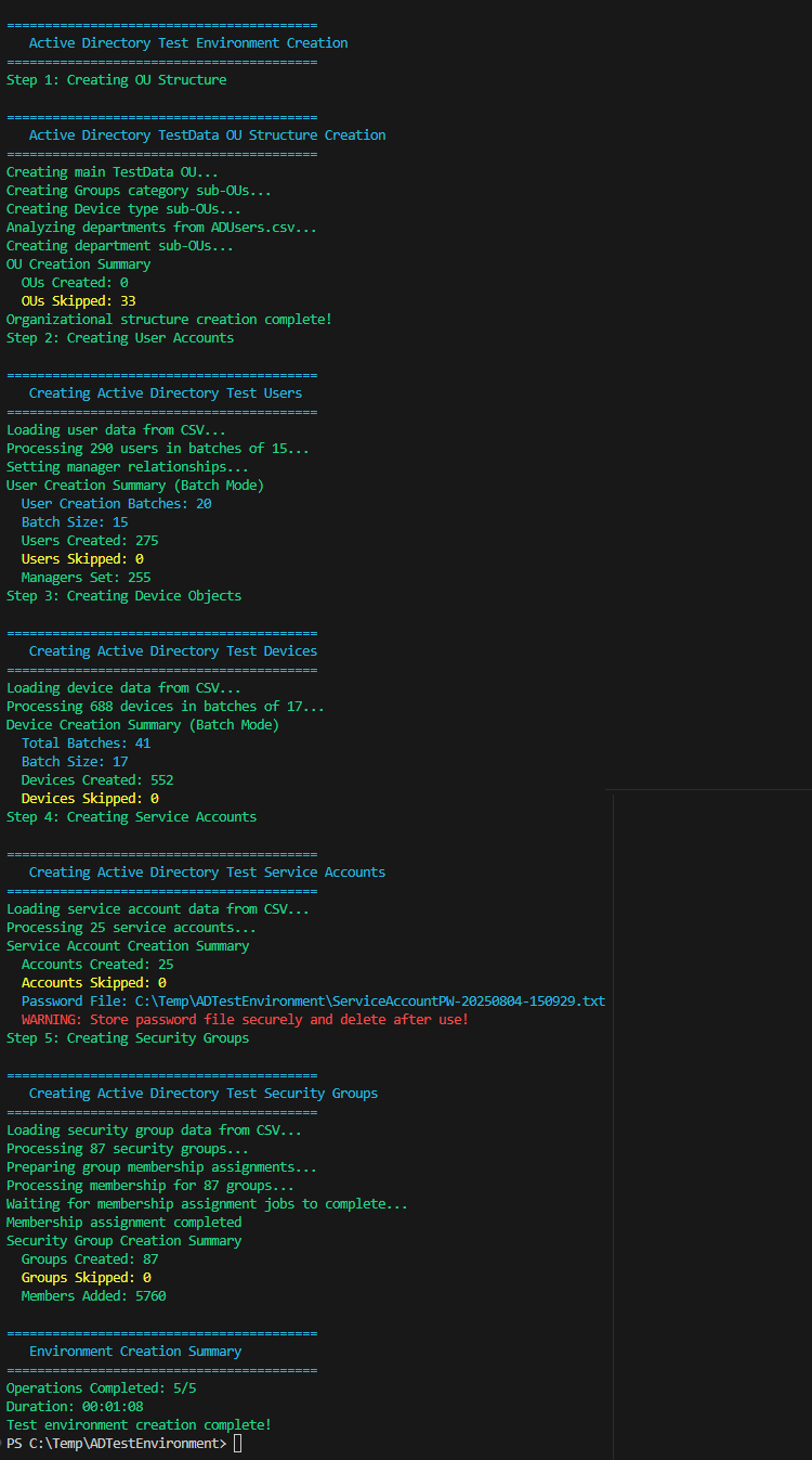 Remove-ADTestEnvironment -RemoveOUs -ForceThis nukes the entire TestData OU and everything in it – no prompts, no mercy. Takes about a minute.