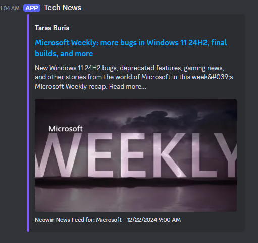With that said, you can now just docker compose up -d and the bot will be sending new posts to the channel as you've configured. Adding/removing feeds as you come across them is as simple as editing the appsettings.json file and restarting the container.