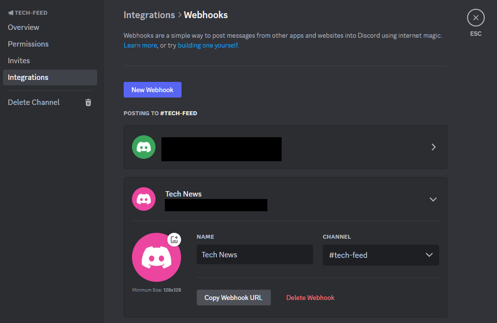 First, in the Discord channel you want to send the RSS notifications to, create a Webhook and copy that URL.